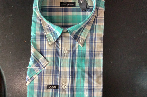 Cotton Traders Aqua Plaid Short Sleeve Sport Shirt